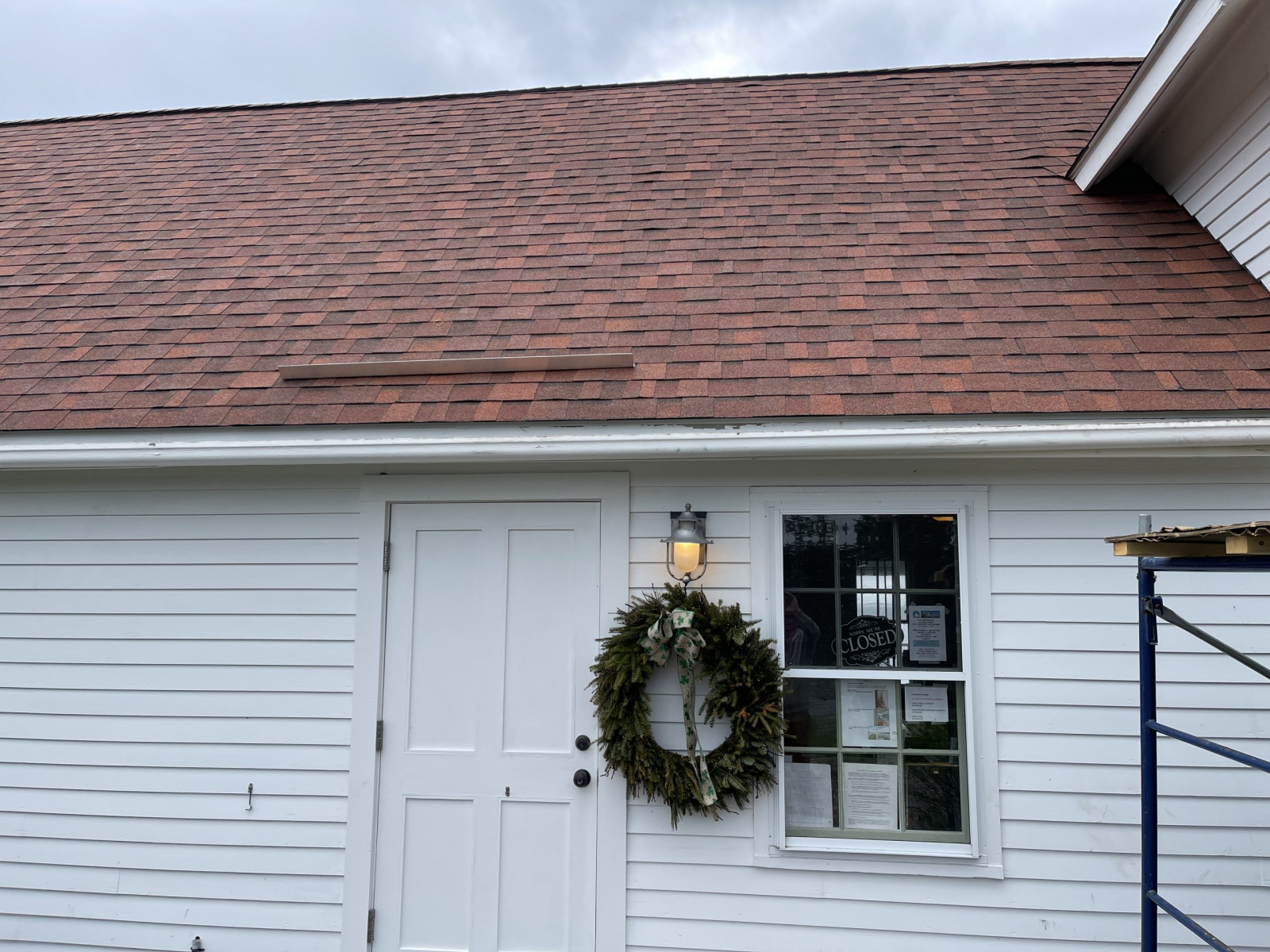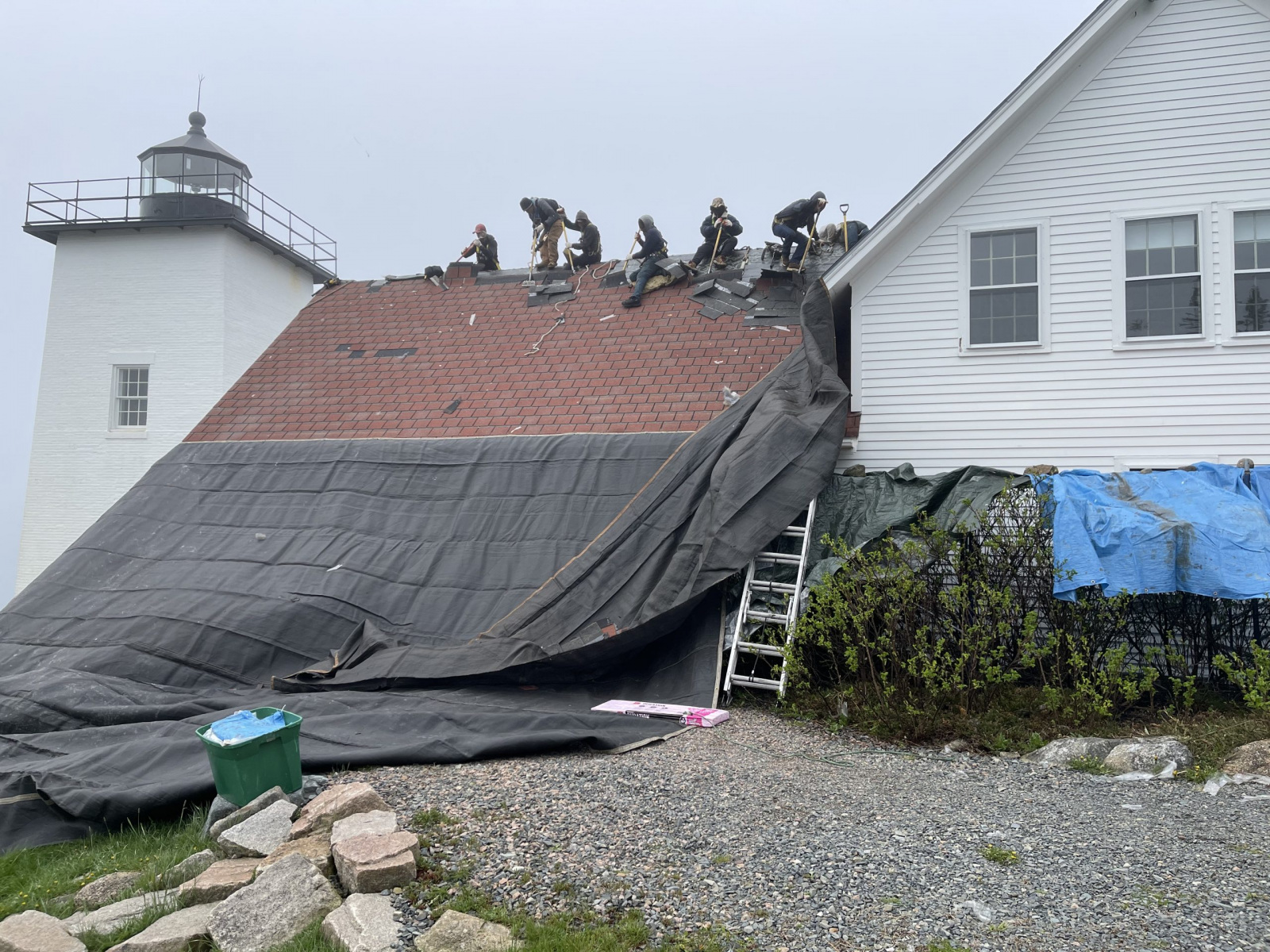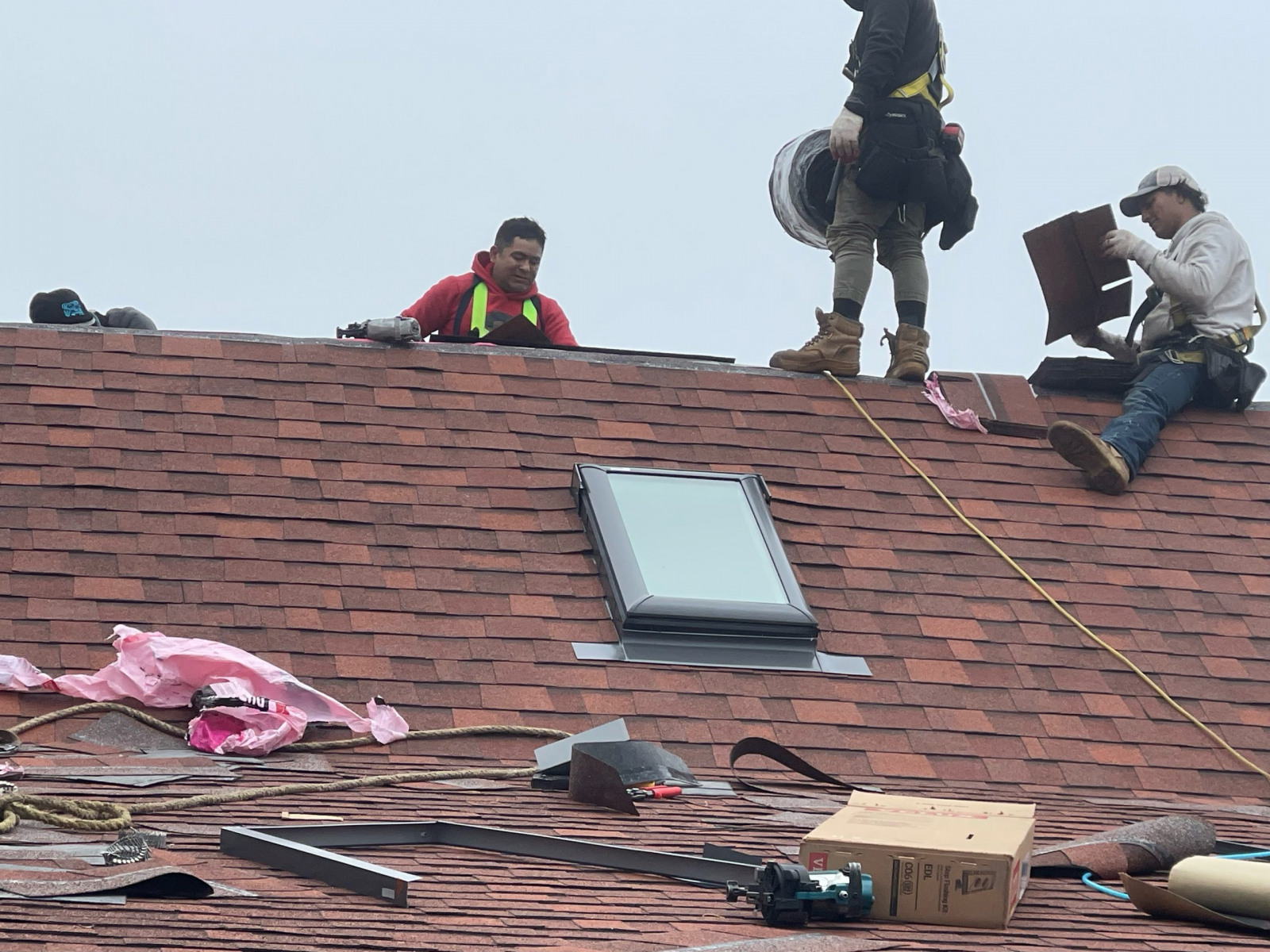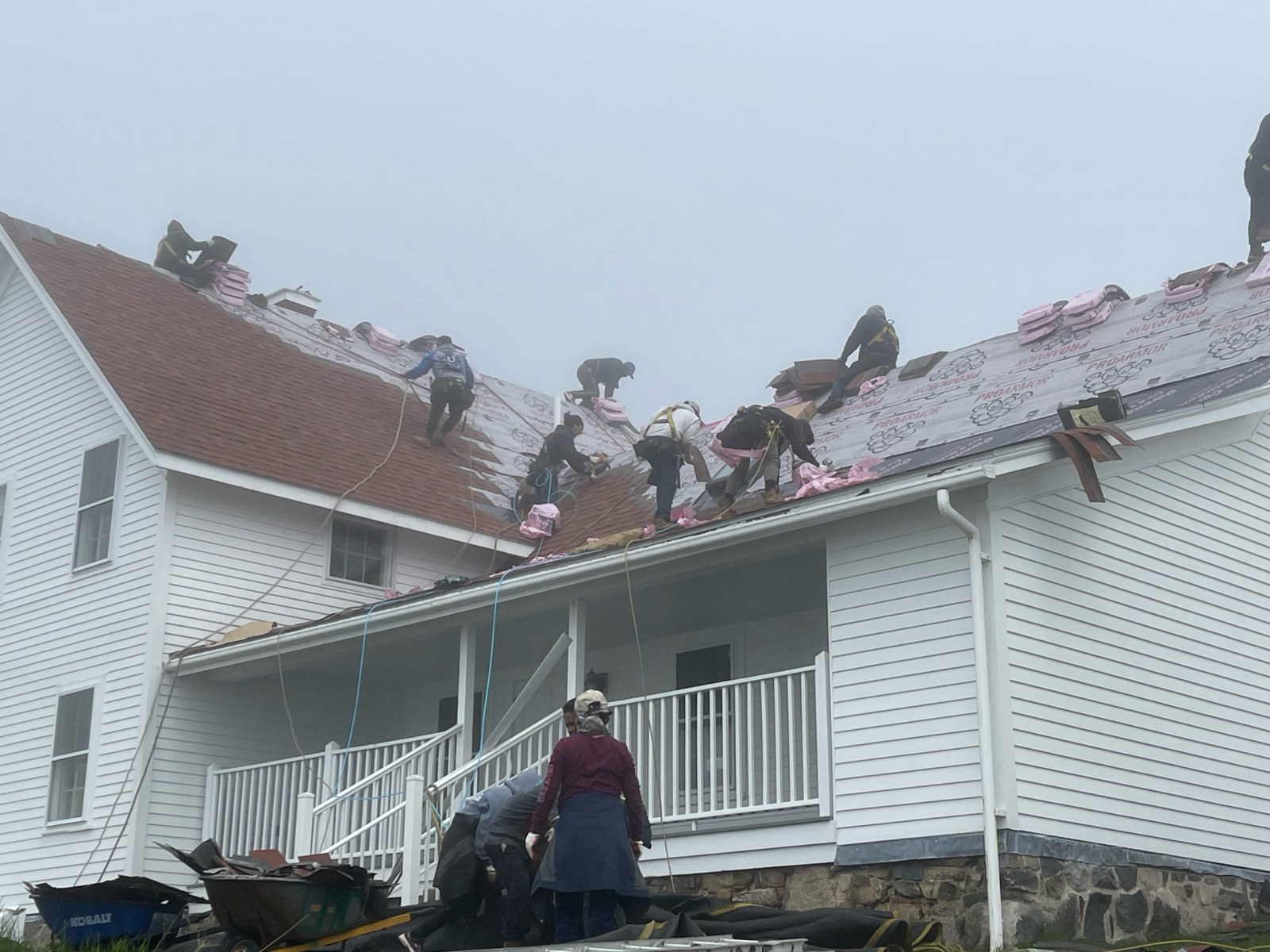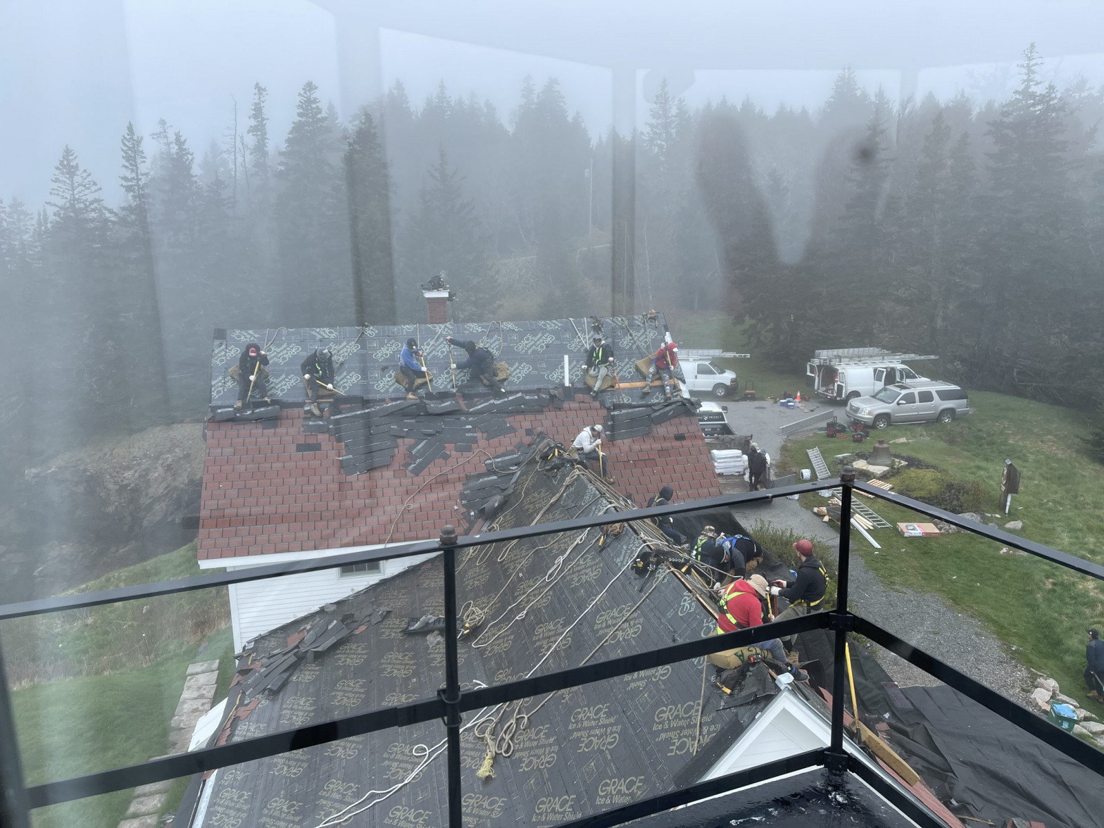 ReRoofing Project Roof Before Showing Many Replaced Shingles Roof Before Repair - Dark Tiles Had Been Replaced Removng Old Roof Shingles View of Workers From Light Tower Crew Installing Shingles Crew Passing Roof Shingles Up New Drip Edge Installed New Skylight Installed Finished Roof Close Up Finished Roof Porch Side Finished Foof Front Entrance