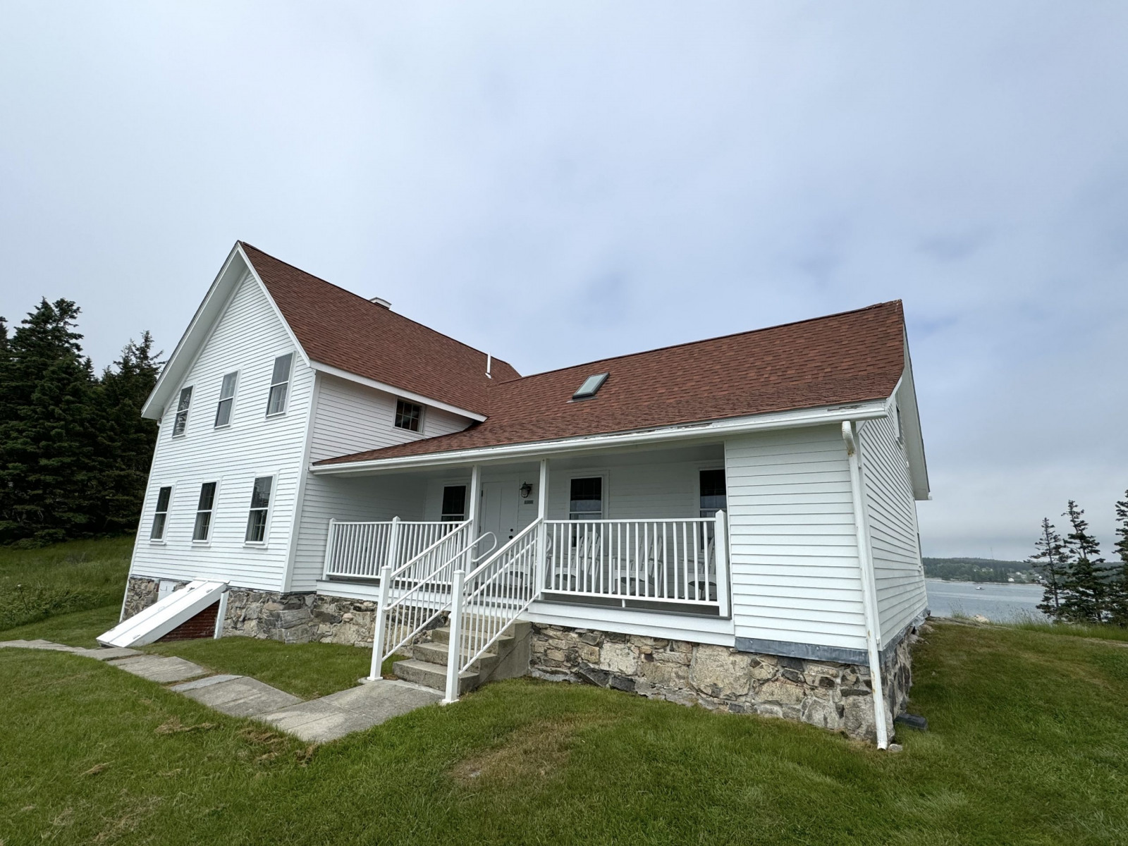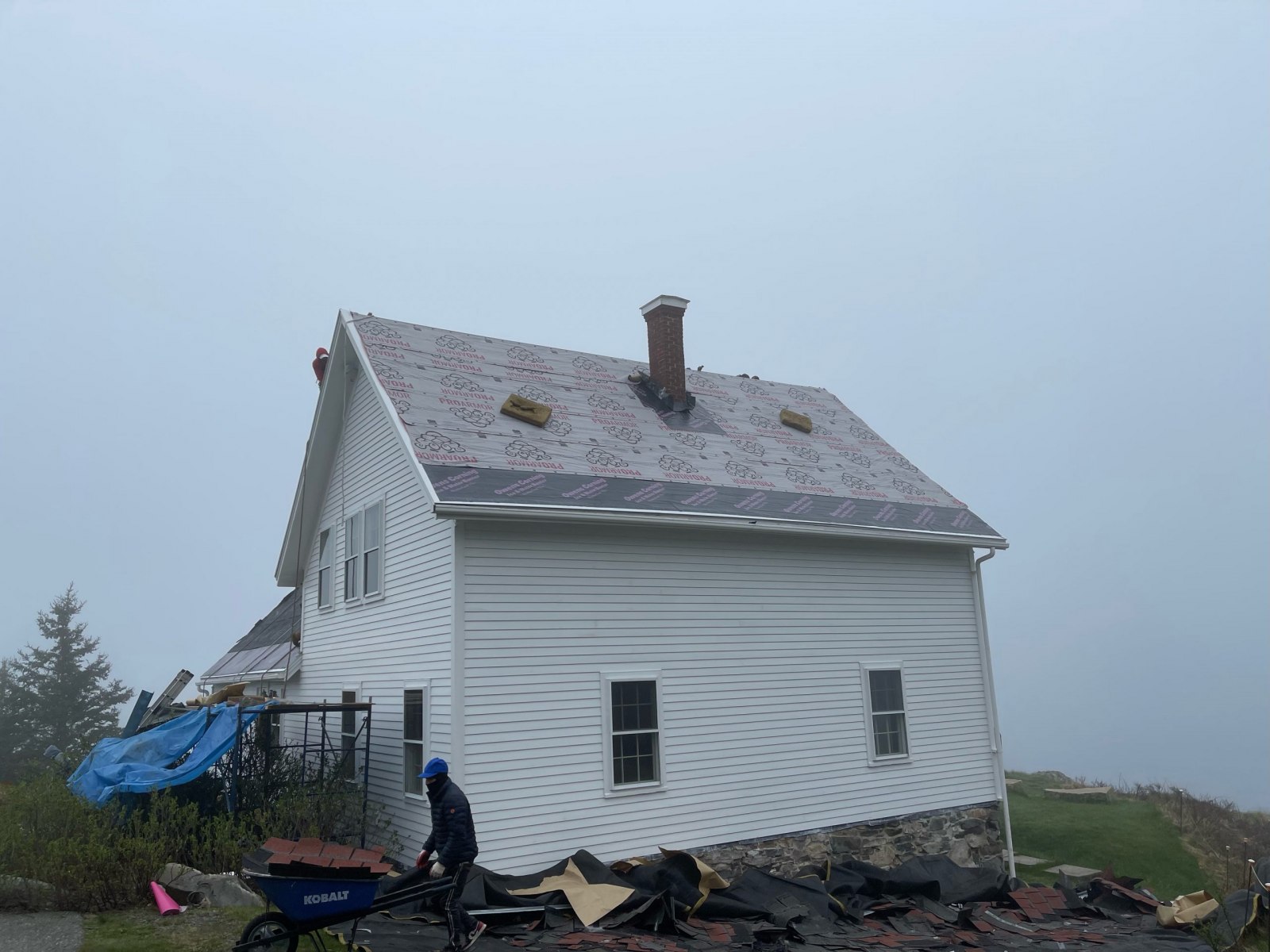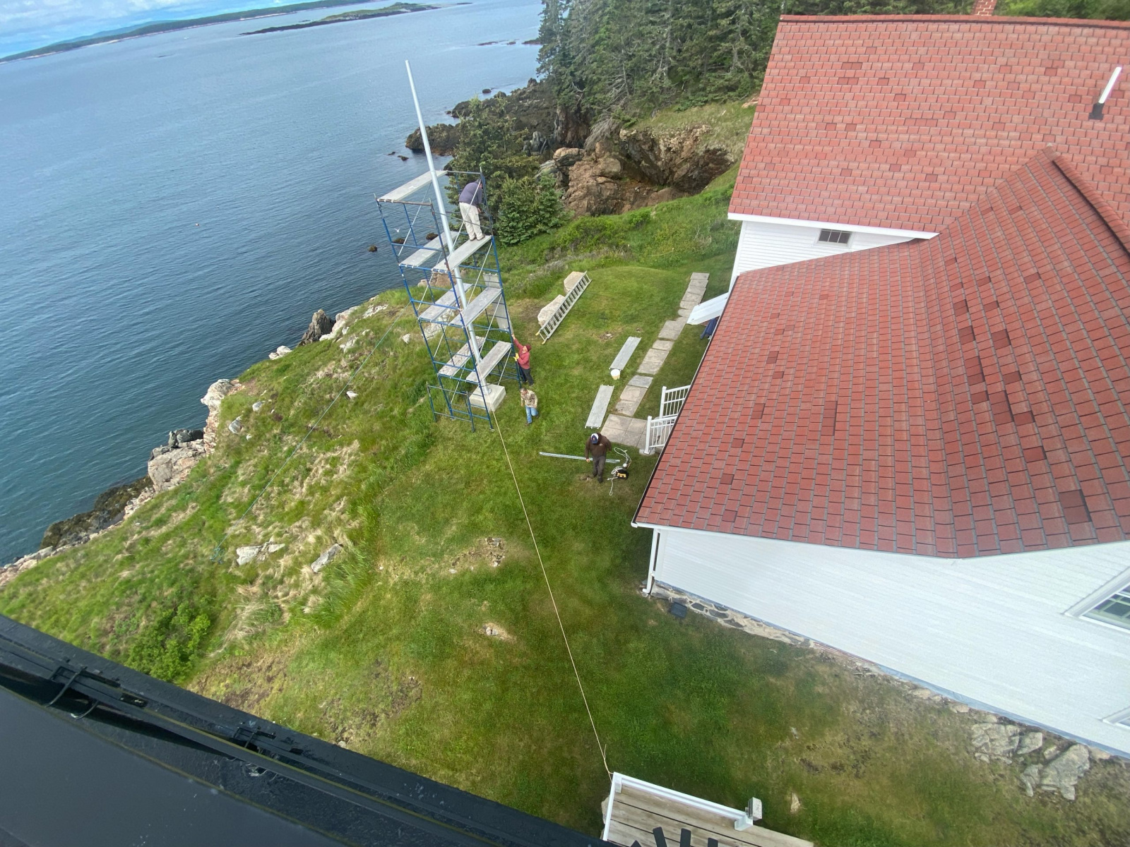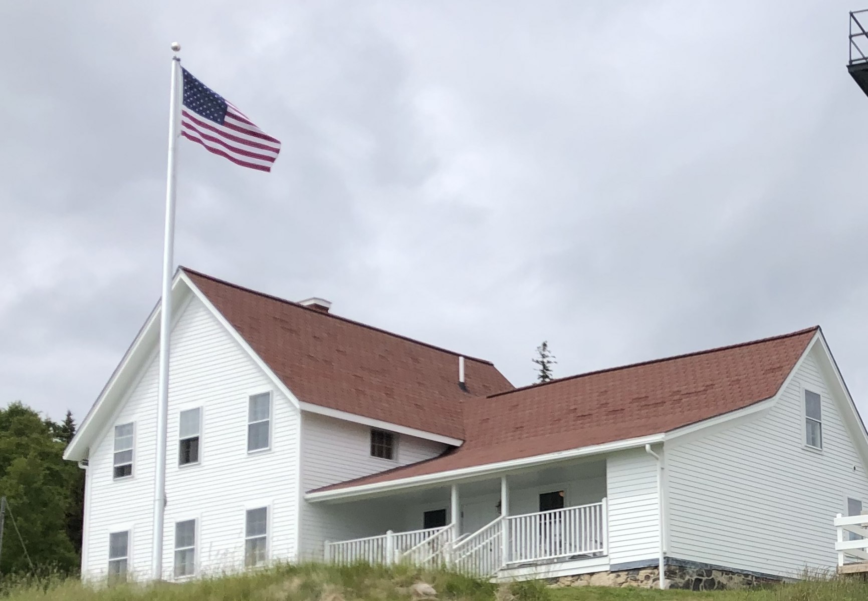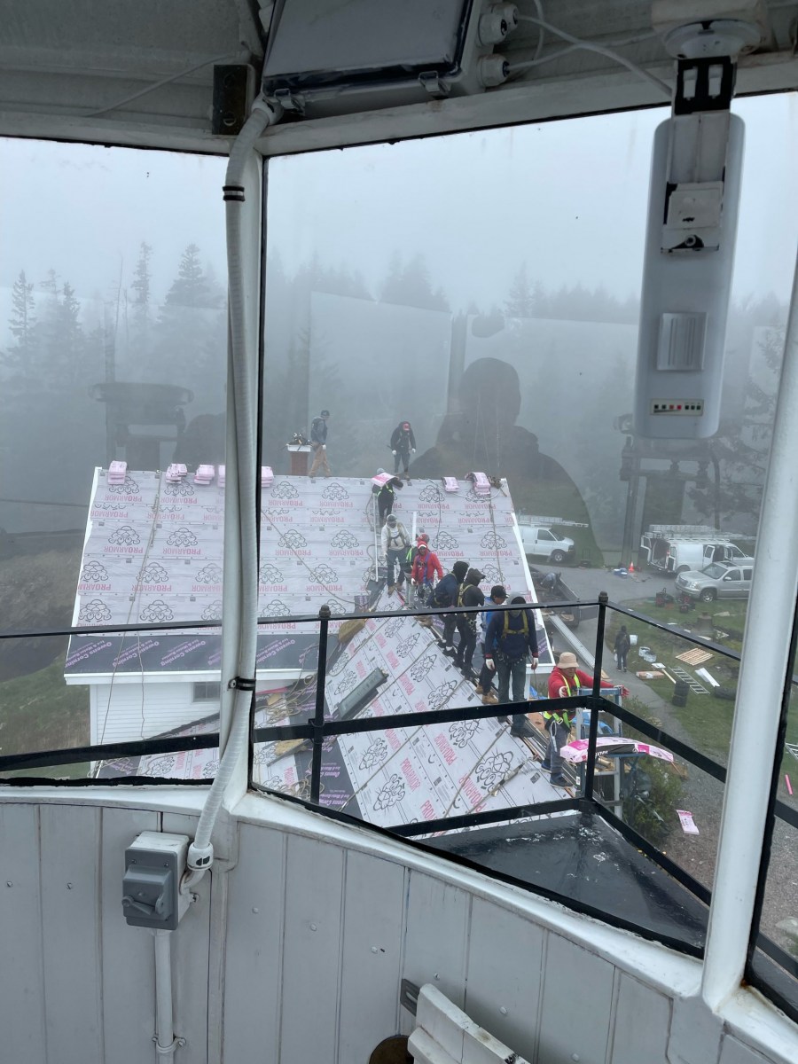 ReRoofing Project Roof Before Showing Many Replaced Shingles Roof Before Repair - Dark Tiles Had Been Replaced Removng Old Roof Shingles View of Workers From Light Tower Crew Installing Shingles Crew Passing Roof Shingles Up New Drip Edge Installed New Skylight Installed Finished Roof Close Up Finished Roof Porch Side Finished Foof Front Entrance