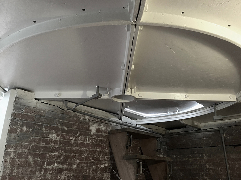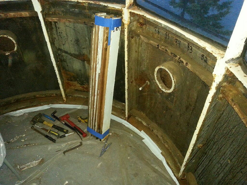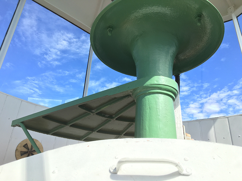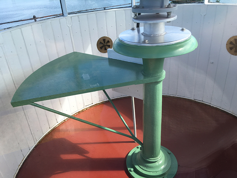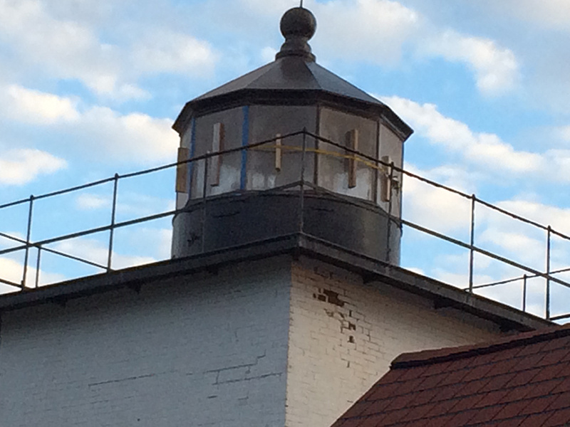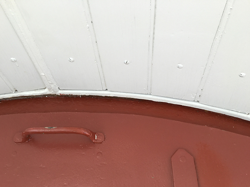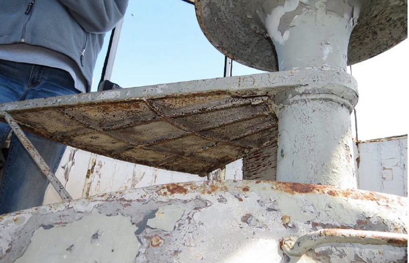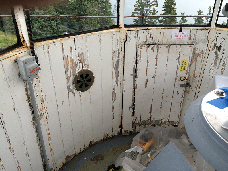 Restoration Phase 1 Plan for repairs, lantern room Lantern room before repair Wainscotting removed Wainscotting repaired Corrosion at floor level Corrosion repaired Floor hatch before restoration Floor hatch restored Vent repaired Vent cover restored Vent levers refabricated Watch room ceiling before restoration Watch room ceiling restored Windows removed Temporary plexiglass window panels Windows returned. Lead paint and corrosion on stairs Stairs repainted Lead paint removed Lantern pedestal before restoration Lantern pedestal restored Restored pedestal